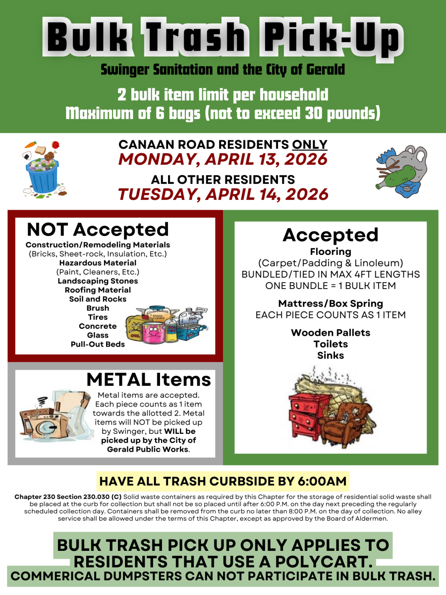 To have your event advertised, please call or come into Gerald City Hall with an event flyer. Events must be open to the public and held within the City of Gerald.